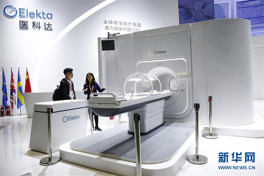 11月6日,瑞典醫科達公司工作人員為一名記者介紹高場強磁共振放療系統Elekta Unity。該款診斷級磁共振成像系統與先進的放療加速器有機結合,可以在腫瘤放療治療的過程中實時、高分辨率地顯示和追蹤腫瘤的變化。 新華社記者 張玉薇 攝