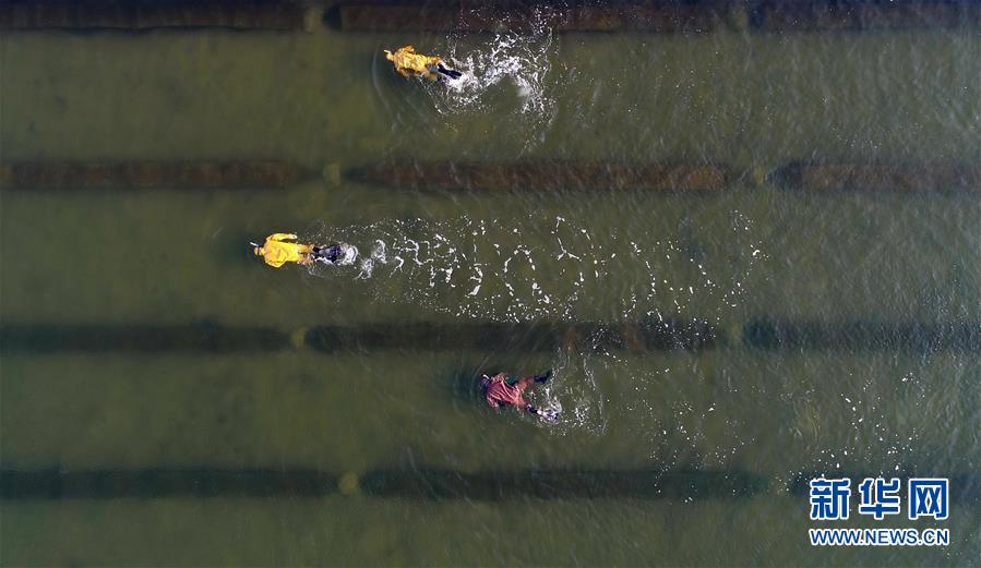 10月22日,樂亭縣姜各莊鎮二節村海參養殖基地的工人在捕撈海參(無人機拍攝)。 時下,正值渤海灣地區海參收獲時節,河北省樂亭縣的海參養殖戶忙著捕撈海參,供應各地市場。據介紹,該縣海域水質優良、氣候適宜,是海參養殖的理想場地,目前發展池塘造礁養殖海參面積6萬畝,年產鮮活海參6000多噸,年產值2億多元。 新華社記者 楊世堯 攝