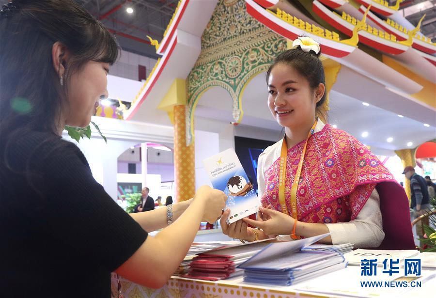 11月7日,在首屆中國國際進口博覽會上,老撾展區工作人員(右)在向參觀者介紹情況。新華社記者 陳飛 攝