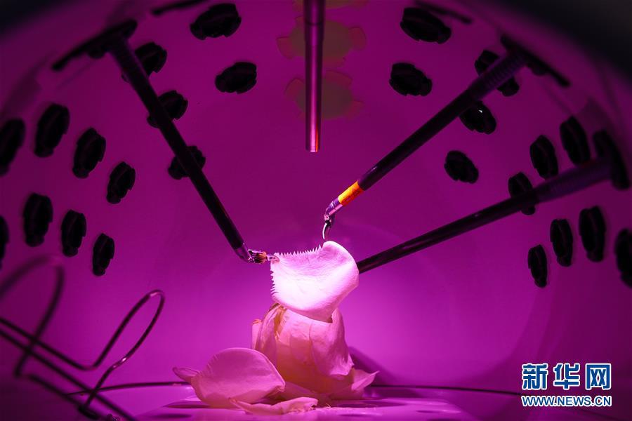 11月8日,在進博會醫療器械及醫藥保健展區,達芬奇Xi手術系統在演示切割花瓣。新華社記者 劉大偉 攝