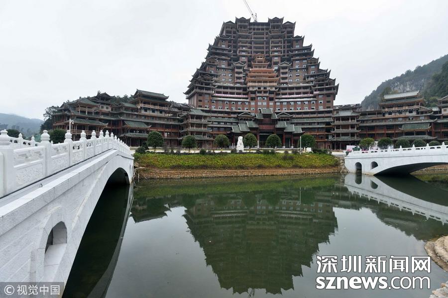 深圳新網網訊 始建于2016年9月的貴州省獨山縣水司樓已進入工程收尾階段。雄偉壯麗造型別致的水司樓,是集會展博覽、酒店住宿、游覽觀光等于一體的大型綜合體。除具有水族特色元素外,該建筑還融合了苗族、布依族特色,是獨山縣凈心谷景區最具標志性的宏大建筑。該樓占地面積5900平方米,總建筑面積60000平方米,樓高99.9米,共24層,是世界上最高大最大最壯觀的水族建筑,被稱為“天下第一水司樓”。 水司樓是按照水族依山畔水而居的傳統習俗和建筑特征修建,是水族人民的文化符號和智慧的象征,背靠凈心河谷山脊,以弧形的平面布局模式,如同張開懷抱的巨人,緊擁美麗的姻脂河灣,設計巧妙,工藝精巧。