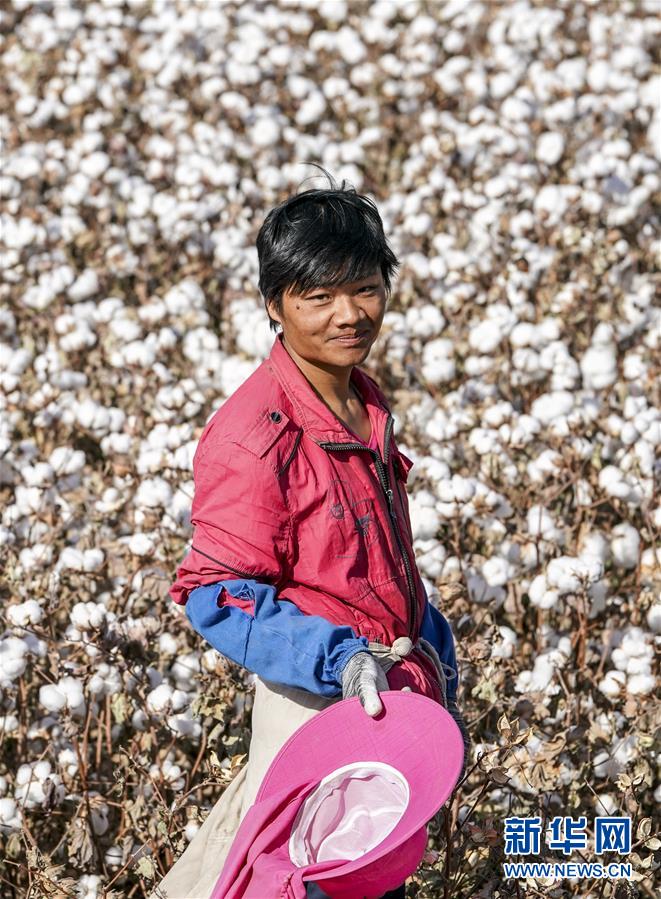 拾花工陳喜波在新疆巴楚縣多來提巴格鄉卡扎尼塔皮提村的棉田中(10月25日攝)。