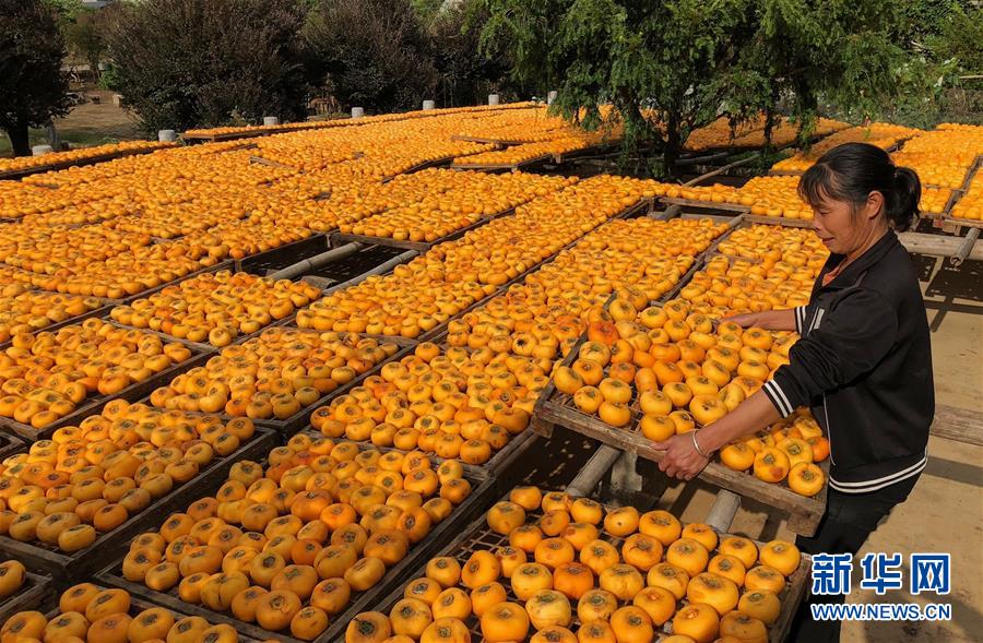 10月17日,廣西桂林市平樂縣沙子鎮渡河村農民在晾曬柿子(手機拍攝)。 金秋時節,農民們忙著收獲成熟的農作物,喜迎豐收。 新華社記者 黃孝邦 攝