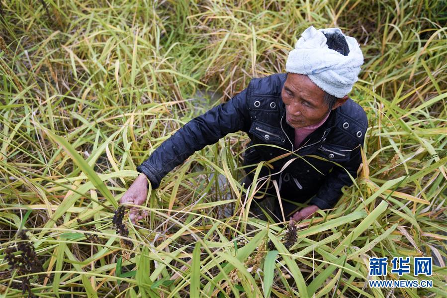 10月17日,在貴州省黔東南苗族侗族自治州從江縣高增鄉占里村,村民在收割香禾糯稻谷。 金秋時節,農民們忙著收獲成熟的農作物,喜迎豐收。 新華社記者陳曄華攝