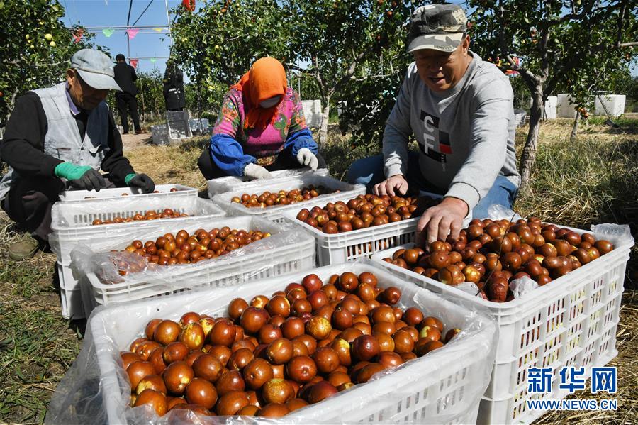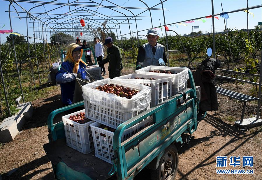 10月17日,在山東省青島市即墨區藍村鎮王演莊北村,種植戶在果園里收集采摘的大棗。 金秋時節,農民們忙著收獲成熟的農作物,喜迎豐收。 新華社記者 李紫恒攝