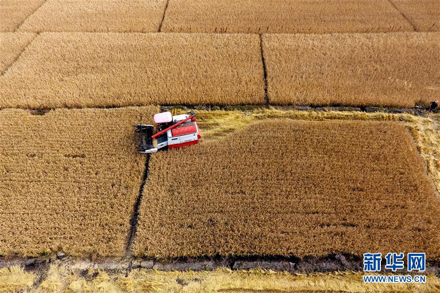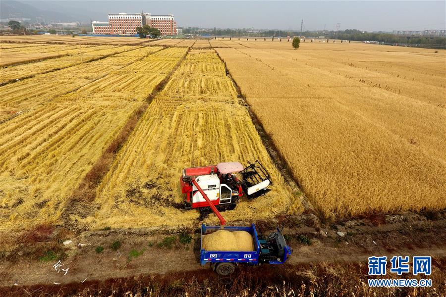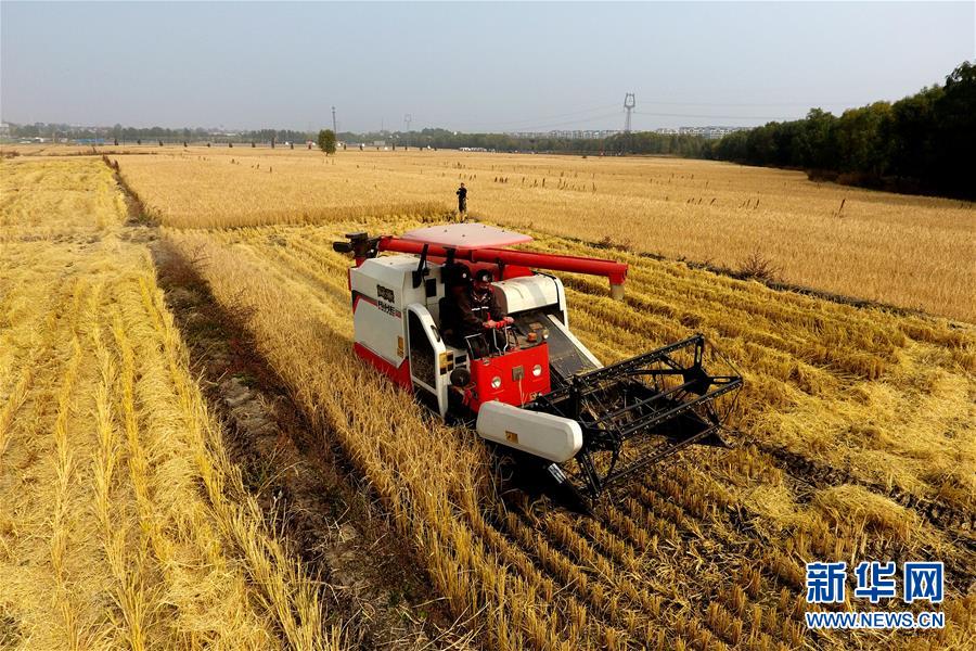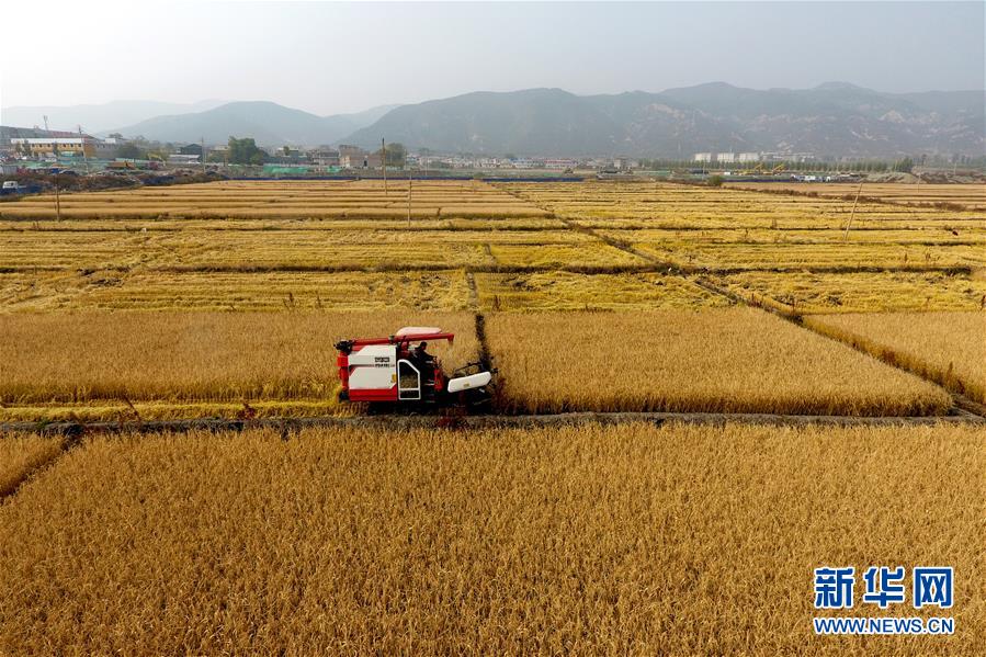 在太原市晉源區赤橋村,收割機在稻田里作業(10月17日無人機拍攝)。近日,山西省太原市晉源區2000多畝水稻迎來收割季。 金秋時節,農民們忙著收獲成熟的農作物,喜迎豐收。 新華社記者 詹彥 攝