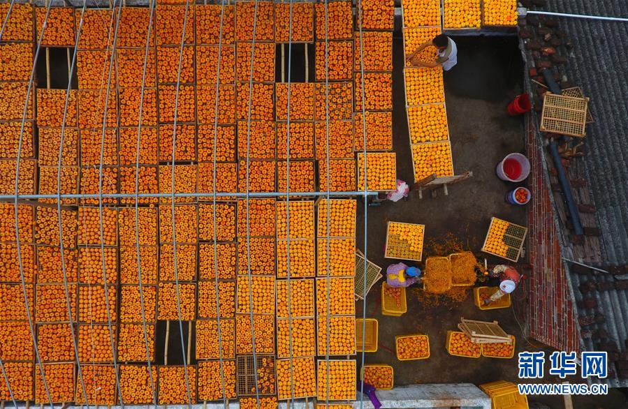 10月17日,廣西桂林市平樂縣沙子鎮渡河村農民在晾曬柿子(無人機拍攝)。 金秋時節,農民們忙著收獲成熟的農作物,喜迎豐收。 新華社記者 黃孝邦 攝