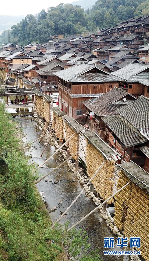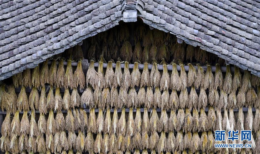 這是貴州省黔東南苗族侗族自治州從江縣高增鄉占里村一處屋檐下晾曬的稻谷(10月17日攝)。 金秋時節,農民們忙著收獲成熟的農作物,喜迎豐收。 新華社記者陳曄華攝
