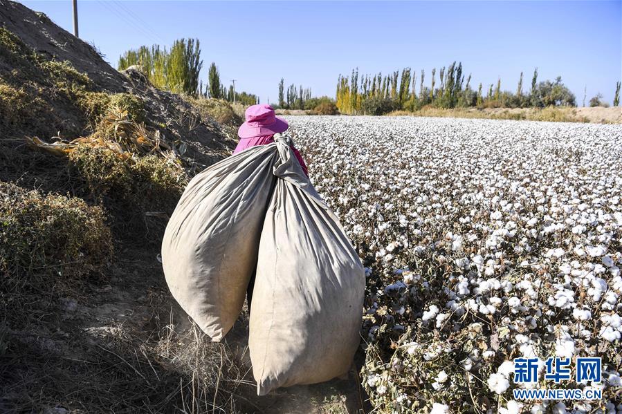 在新疆巴楚縣多來提巴格鄉卡扎尼塔皮提村,陳喜波背著兩袋棉花行走在棉田里(10月24日攝)。