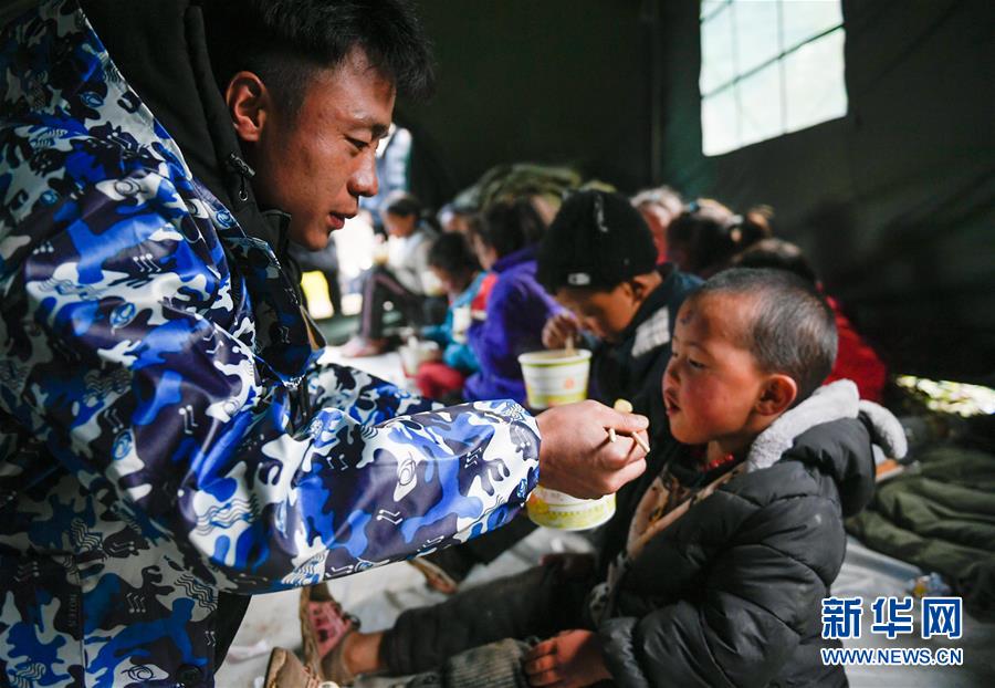 波羅鄉一名工作人員在臨時過渡安置點帳篷內給一名兒童喂飯(10月14日攝)。 新華社記者 劉東君 攝