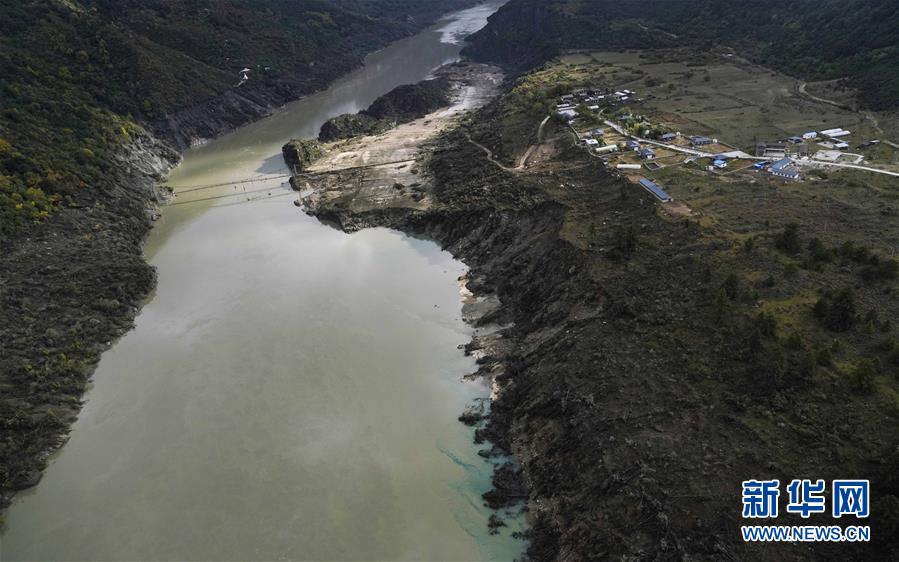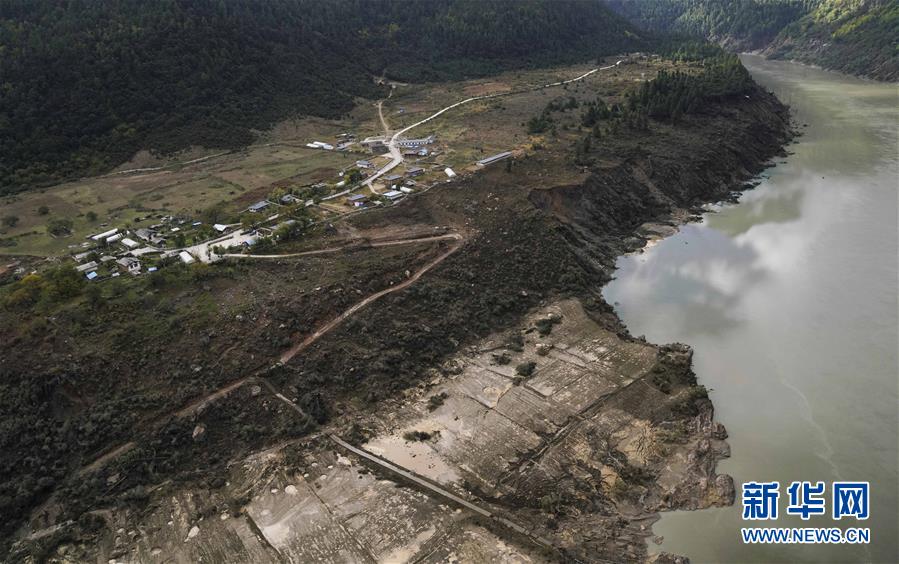 10月20日拍攝的西藏雅魯藏布江米林縣堰塞湖自然過流后的加拉村。 10月19日13時30分,西藏雅魯藏布江米林縣堰塞湖開始自然過流。記者從應急管理部牽頭的聯合工作組獲悉,截至20日7時,雅魯藏布江堰塞湖壩前水位已下降56米,估算留存水量1.6億立方米,堰塞湖洪水威脅得到緩解,防洪安全風險大大減輕,并將繼續降低。 10月20日,記者乘坐直升機從空中拍攝了雅魯藏布江堰塞湖自然過流的畫面。 新華社記者普布扎西攝