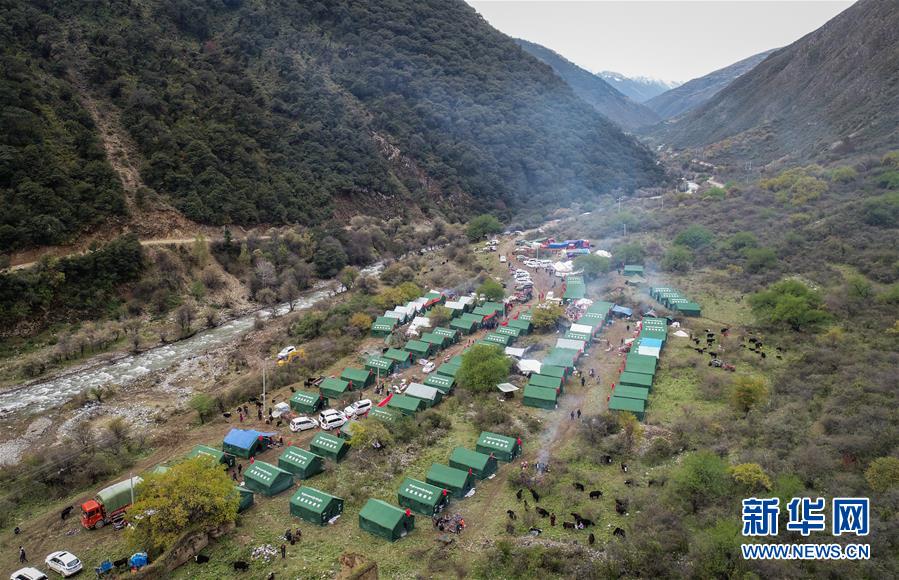 10月19日無人機拍攝的在米林縣派鎮達林村搭建的安置點。 記者從西藏自治區林芝加拉村雅魯藏布江堰塞湖災情應急搶險工作第二場新聞發布會上獲悉,19日13時30分,雅魯藏布江米林縣堰塞體上游水位超過堰塞體,開始自然過流,上游水位正在緩慢下降。目前,各項搶險救援工作正在有序開展。 新華社記者 普布扎西 攝