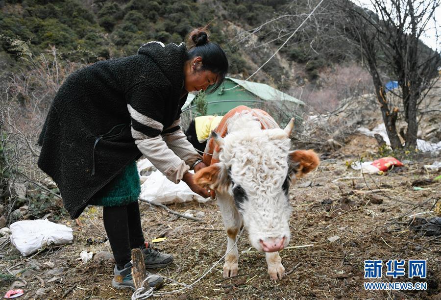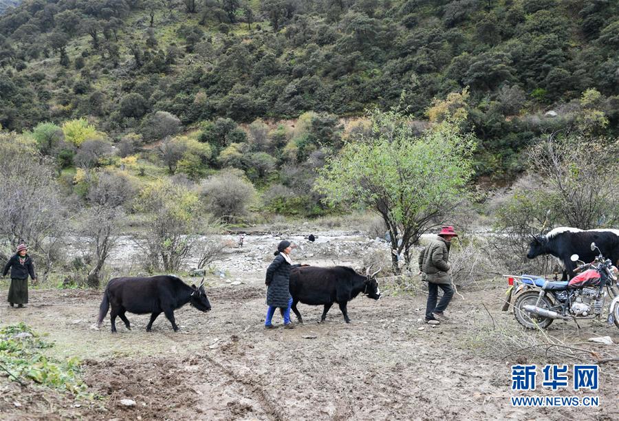 波羅鄉一臨時過渡安置點內的群眾在放牛(10月14日攝)。 新華社記者 劉東君 攝