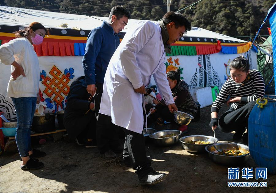 11月12日,在西藏昌都市江達縣波羅鄉康扎西安置點,工作人員在臨時廚房打飯。 西藏自治區江達縣波羅鄉康扎西安置點,離波羅鄉政府直線距離約3公里,位于一處地勢開闊平緩的山谷中,比堰塞湖水面高出100多米。10月11日金沙江白格段山體滑坡發生后,當地就在這里設立了安置點,安置附近受災群眾。 新華社記者 劉東君 攝