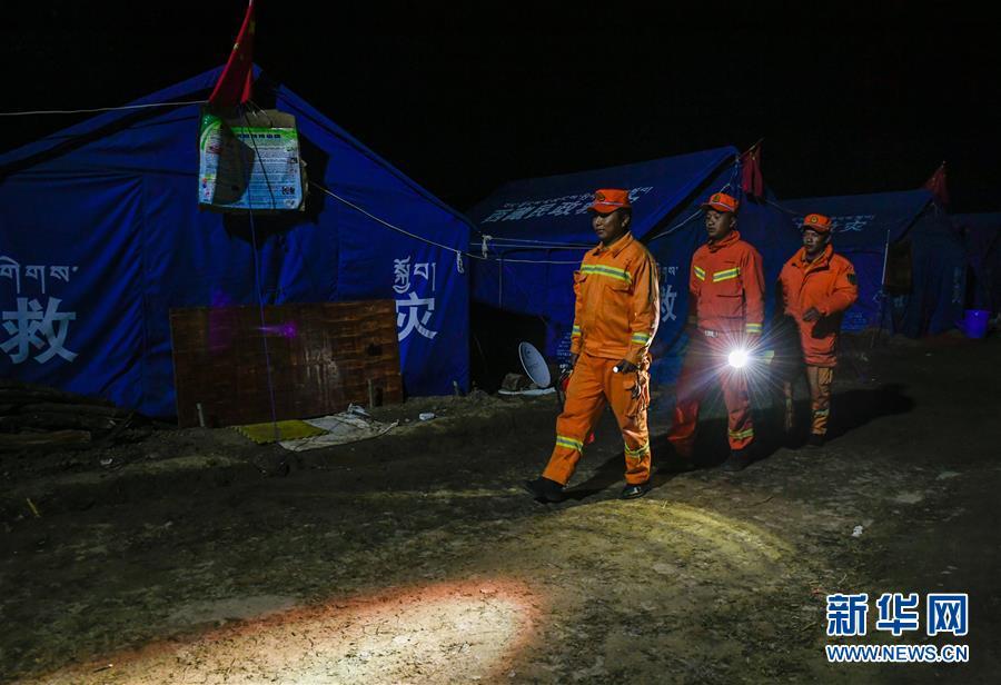 在西藏昌都市江達縣波羅鄉康扎西安置點內,消防隊員進行火災隱患巡邏排查(11月11日攝)。 西藏自治區江達縣波羅鄉康扎西安置點,離波羅鄉政府直線距離約3公里,位于一處地勢開闊平緩的山谷中,比堰塞湖水面高出100多米。10月11日金沙江白格段山體滑坡發生后,當地就在這里設立了安置點,安置附近受災群眾。 新華社記者 劉東君 攝