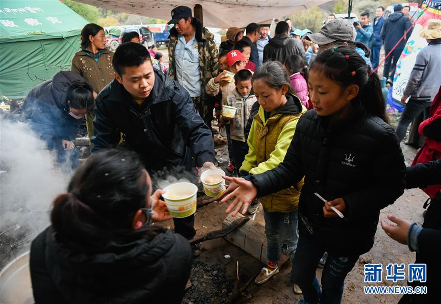 波羅鄉工作人員在熱多村安置點內的“臨時做飯點”為波羅鄉第一小學學生盛晚飯(10月14日攝)。
