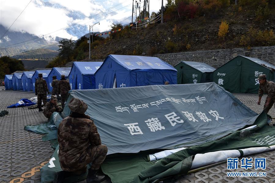 10月19日,救援人員在米林縣派鎮尼定村搭建安置點。 記者從西藏自治區林芝加拉村雅魯藏布江堰塞湖災情應急搶險工作第二場新聞發布會上獲悉,19日13時30分,雅魯藏布江米林縣堰塞體上游水位超過堰塞體,開始自然過流,上游水位正在緩慢下降。目前,各項搶險救援工作正在有序開展。 新華社記者 覺果 攝