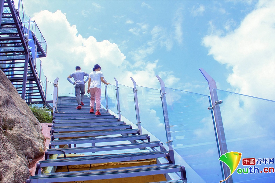 2018年8月,廣東清遠。如今,玻璃橋、玻璃觀景臺、玻璃漂流道、玻璃滑道等玻璃產品可以說多如牛毛,琳瑯滿目。這些玻璃產品都是水平的,即使有坡度,也是借助工具滑下去的。小伙伴們是否挑戰體驗過像樓梯一樣的玻璃天梯,階梯式攀向高處,直聳云宵,云霧飄渺。
