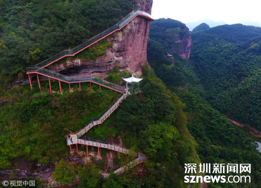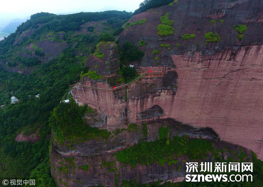 深圳新聞網訊 2018年6月19日,航拍江西贛州南武當山百米高空玻璃棧道。棧道緊貼峭壁,在懸崖之上凌空蜿蜒穿行,猶如一條玉龍盤旋在綠林石海之中。 南武當山位于江西最南端的龍南縣武當鎮境內,景區核心面積達到13.5平方公里,擁有99座千姿百態的巍峨石峰,丹霞地質風貌突出,連綿十里,被稱為“武當十里畫廊”。