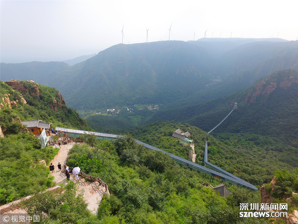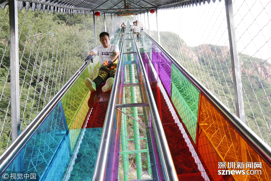 深圳新聞網訊 2018年8月11日,鄭州,雙排高空玻璃滑道亮相伏羲山三泉湖景區,整條滑道從高空俯視,呈龍形蜷曲姿態俯臥于玫瑰嶺下,與中原第一鳳凰天橋首尾相接。