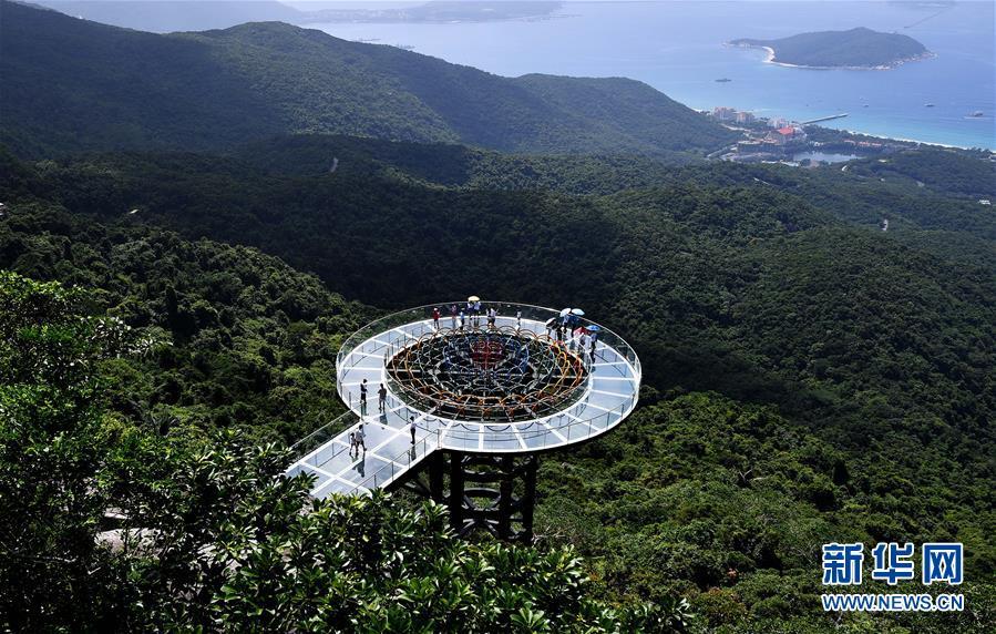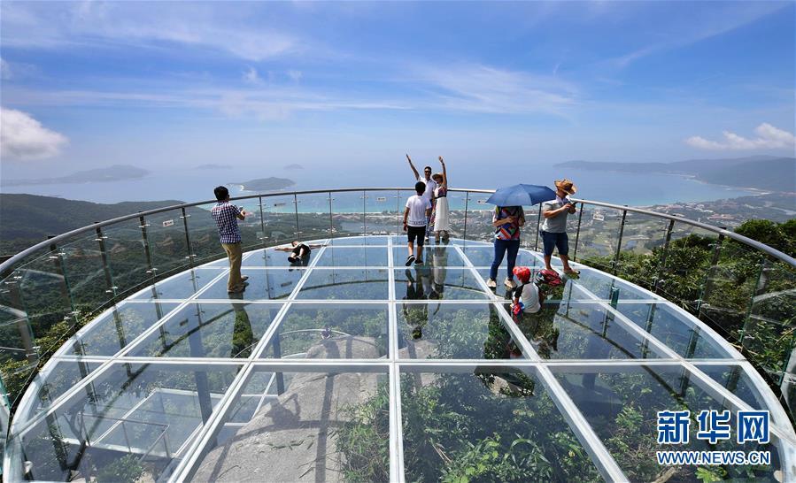 8月31日,游客在玻璃觀景平臺上參觀游覽。近日,位于海南省三亞市亞龍灣熱帶天堂森林公園的大佛石全海景玻璃棧道開始正式營業。凌空而建的玻璃棧道全長400米,游客可將亞龍灣的美景盡收眼底。新華社記者郭程攝