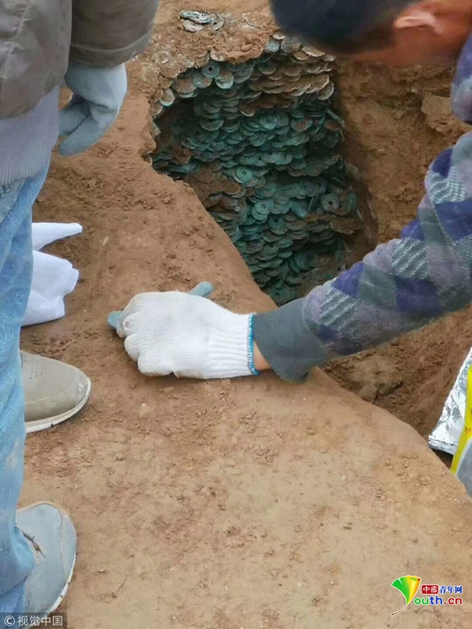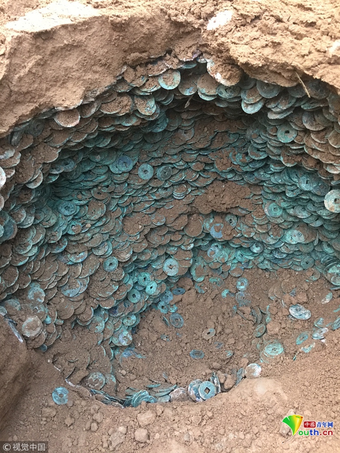 2018年11月9日,陜西渭南,白水一工地發現大量古幣,共清理發掘古幣920斤、約10萬枚。經初步鑒定,這些古幣多為北宋時期錢幣,初步判斷為一般文物,對研究當地經濟等有一定價值。圖片:視覺中國。文字:華商報