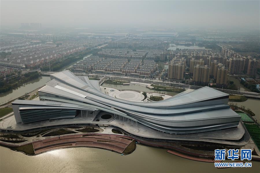 11月14日無人機拍攝的湖州市吳興區八里店農民社區及新落成的吳興區文體中心(前方建筑)。 浙江省湖州市吳興區八里店農民社區目前安置居民近4萬人,整個區域內公共設施配套齊全,路網交通便捷順暢,綠化生態自然和諧,社區活動豐富多彩。 新華社記者 黃宗治 攝