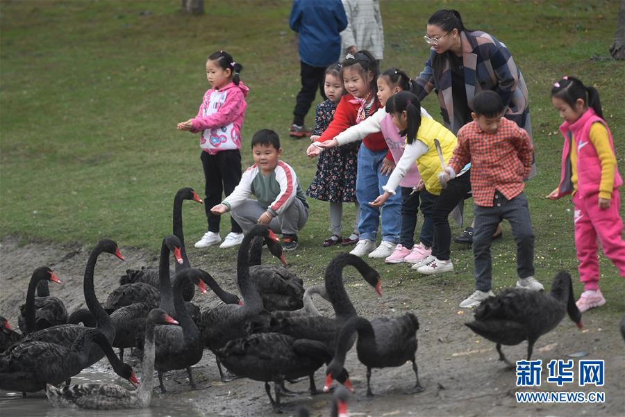 11月14日,湖州市吳興區八里店農民社區的小朋友在公園給黑天鵝喂食。 浙江省湖州市吳興區八里店農民社區目前安置居民近4萬人,整個區域內公共設施配套齊全,路網交通便捷順暢,綠化生態自然和諧,社區活動豐富多彩。 新華社記者 黃宗治 攝