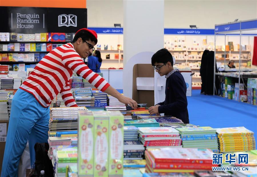 11月14日,在科威特國際展覽中心,工作人員(左)向一個男孩介紹圖書。 第43屆科威特國際書展14日在科威特國際展覽中心開幕,共有來自26個國家和地區的505家出版機構參展。 新華社記者 聶云鵬 攝