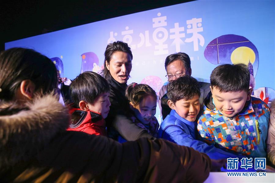 11月20日,在北京舉行的世界兒童日主題活動上,聯合國兒童基金會大使陳坤與孩子們共同點亮國家游泳中心。 新華社記者張玉薇攝