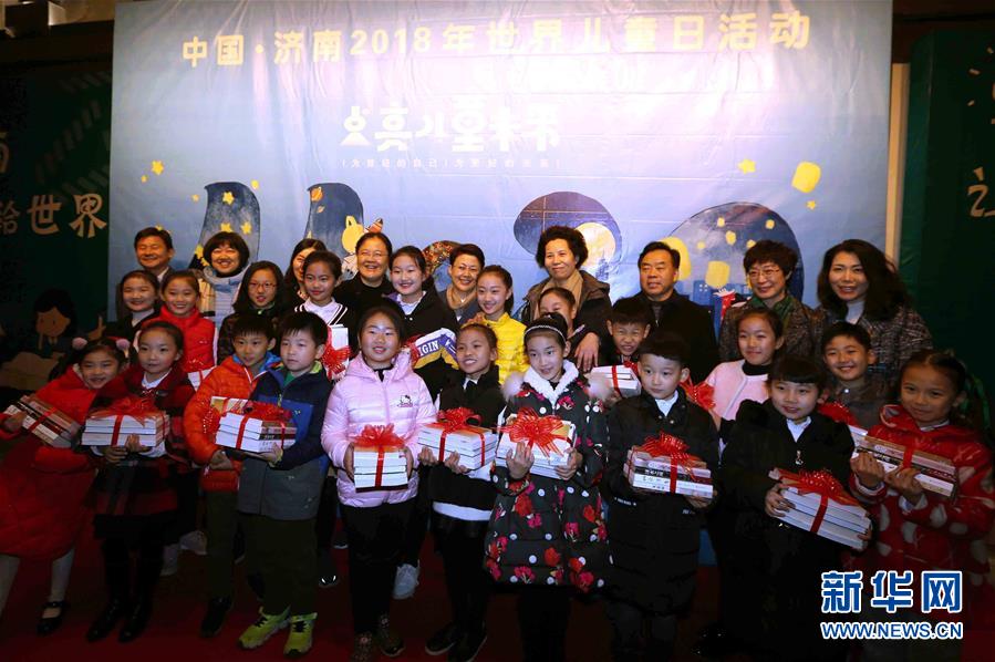 11月20日,在濟南舉行的世界兒童日主題活動上,孩子們拿著獲贈的經典書籍合影留念。 新華社發(李俊卓攝)