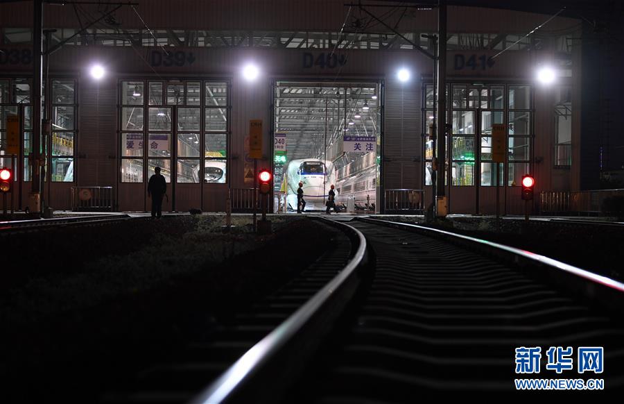 4月29日夜,工作人員在合肥南動(dòng)車運(yùn)用所內(nèi)對(duì)動(dòng)車組進(jìn)行清潔。每當(dāng)夜深人靜的時(shí)候,合肥南動(dòng)車運(yùn)用所卻燈火通明,“動(dòng)車安全守護(hù)者”們堅(jiān)守崗位,對(duì)動(dòng)車組進(jìn)行全面細(xì)致檢修。新華社記者 劉軍喜 攝