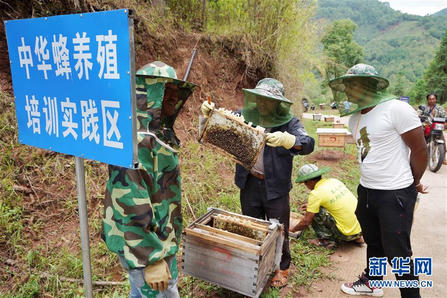 2020年5月3日,湖北省襄陽市,南漳三道河水庫小島養蜂人趙德海養的蜜蜂為土蜂(又稱中華蜜蜂),不用向其他養蜂人一樣轉場,可以定居在山中飼養。