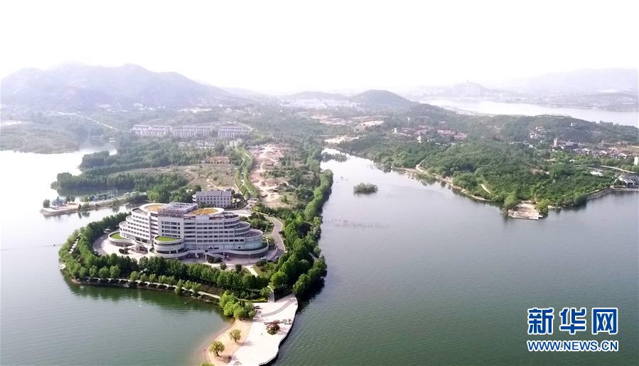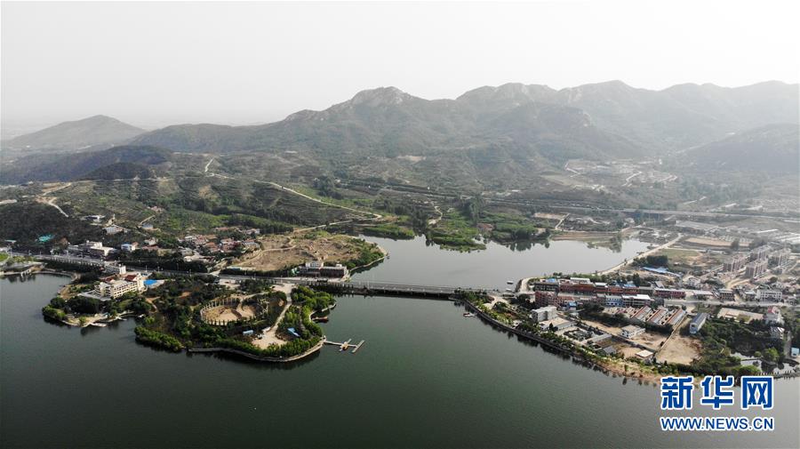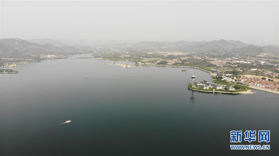 這是5月17日拍攝的雪野湖景色(無人機照片)。山東濟南風景區——雪野湖波光粼粼,岸邊綠樹環抱,加上星星點點的帆船在湖面搖曳,景色宜人。新華社記者王凱攝