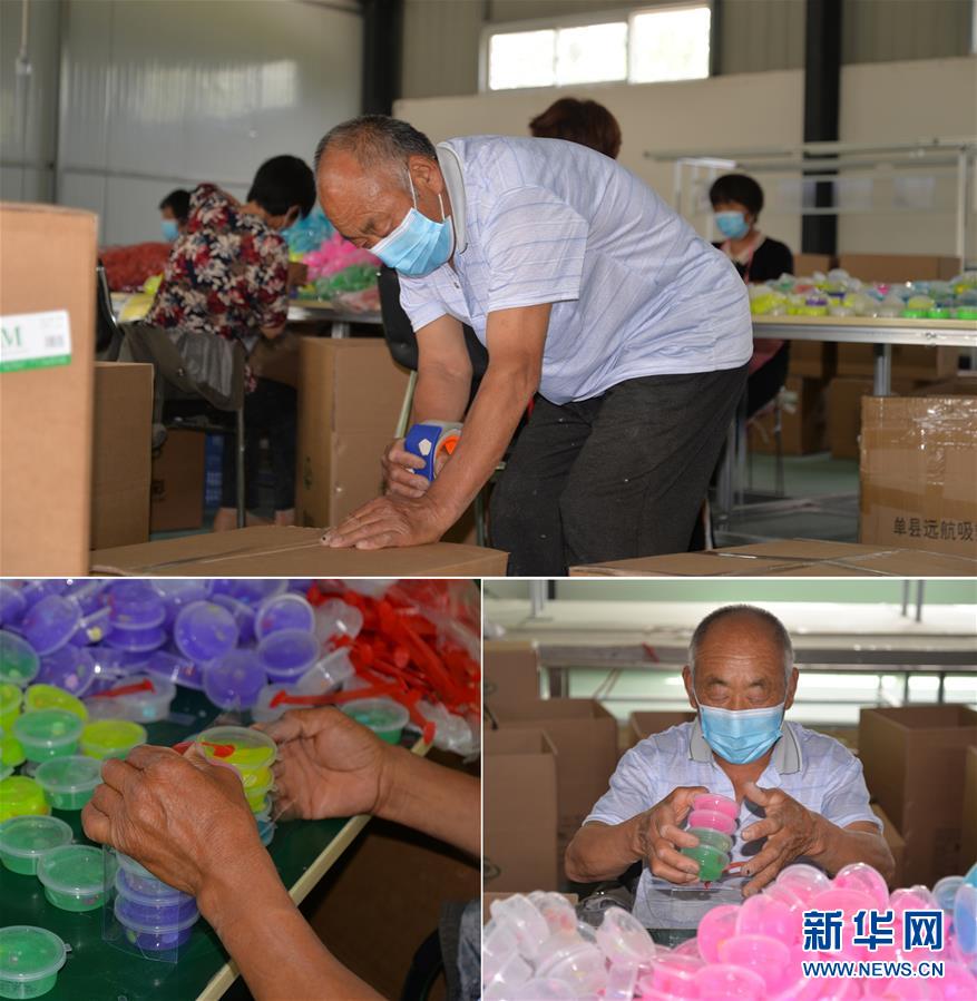 這是一張拼版照片(圖片均為5月16日攝)。上圖:在河南省開封市尉氏縣大橋鄉馮村扶貧車間,65歲的鄭春嶺用膠帶把裝滿玩具的紙箱封上。依靠村內扶貧車間,他走上致富的道路;下左圖、下右圖:鄭春嶺在打包玩具。新華社記者孫清清攝