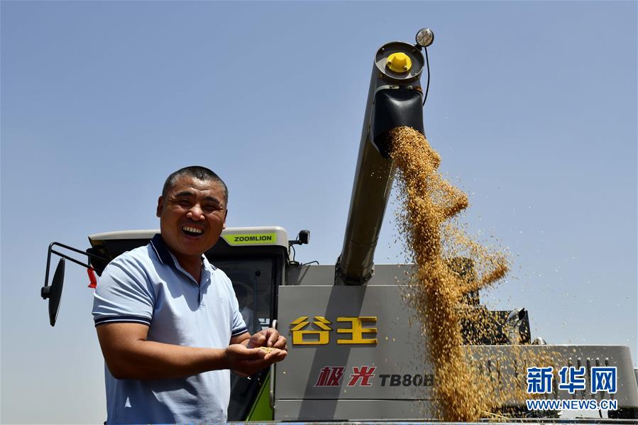 6月3日,在汶上縣郭倉鎮,種糧大戶郭波波在收獲小麥。目前,我國第二大小麥主產區山東6000多萬畝小麥進入收獲階段。農民們搶抓有利天氣,自南向北陸續開鐮。新華社記者郭緒雷攝。