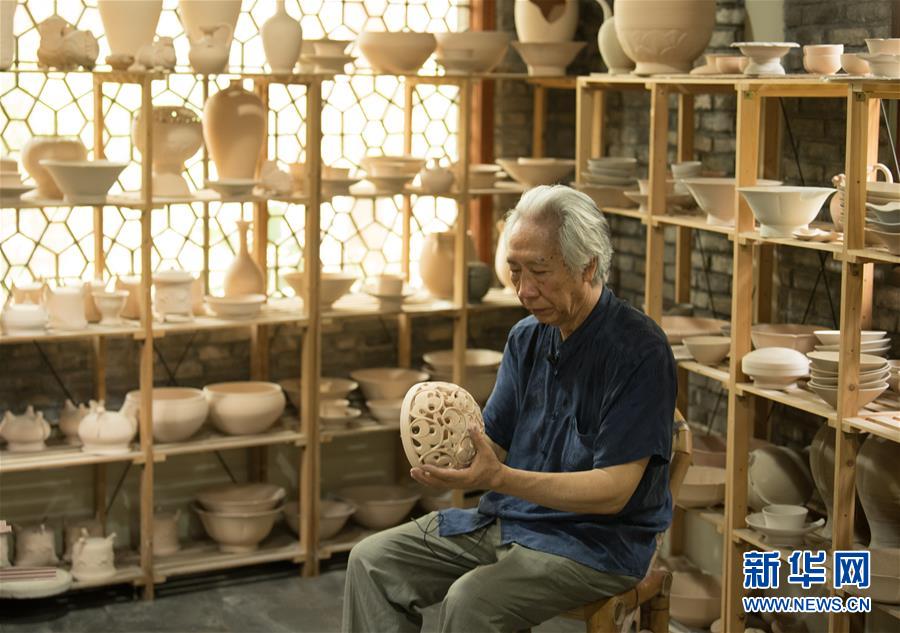 6月17日,在位于浙江慈溪的工作室,聞長慶查看一件剛浸釉完畢的盞托。新華社記者 翁忻旸 攝