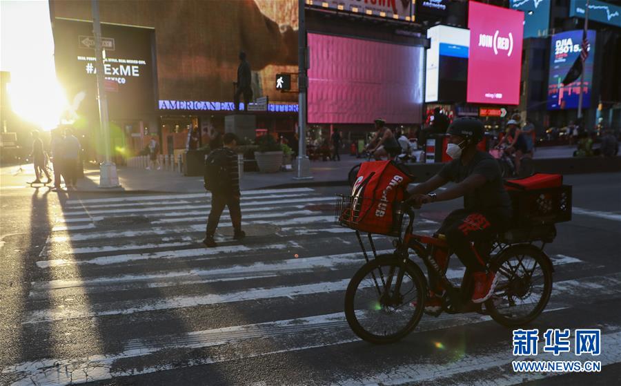 6月27日,一名送貨員騎車經過美國紐約時報廣場。美國約翰斯·霍普金斯大學27日發布的新冠疫情最新統計數據顯示,截至美國東部時間27日16時35分(北京時間28日4時35分),美國累計新冠確診病例2500419例,累計死亡病例125434例。新華社記者王迎攝