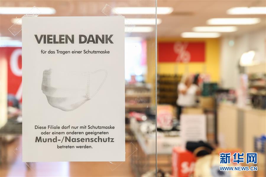 這是7月7日在德國首都柏林拍攝的一間商鋪張貼著提示顧客佩戴口罩的告示。針對有地方官員呼吁取消民眾乘坐公交車和在商場購物時須戴口罩的規(guī)定,德國聯(lián)邦政府6日表示,支持延續(xù)“口罩強制令”。4月底,德國全部16個聯(lián)邦州陸續(xù)出臺“口罩強制令”,即居民在乘坐公交車和購物時須佩戴口罩。新華社記者單宇琦攝