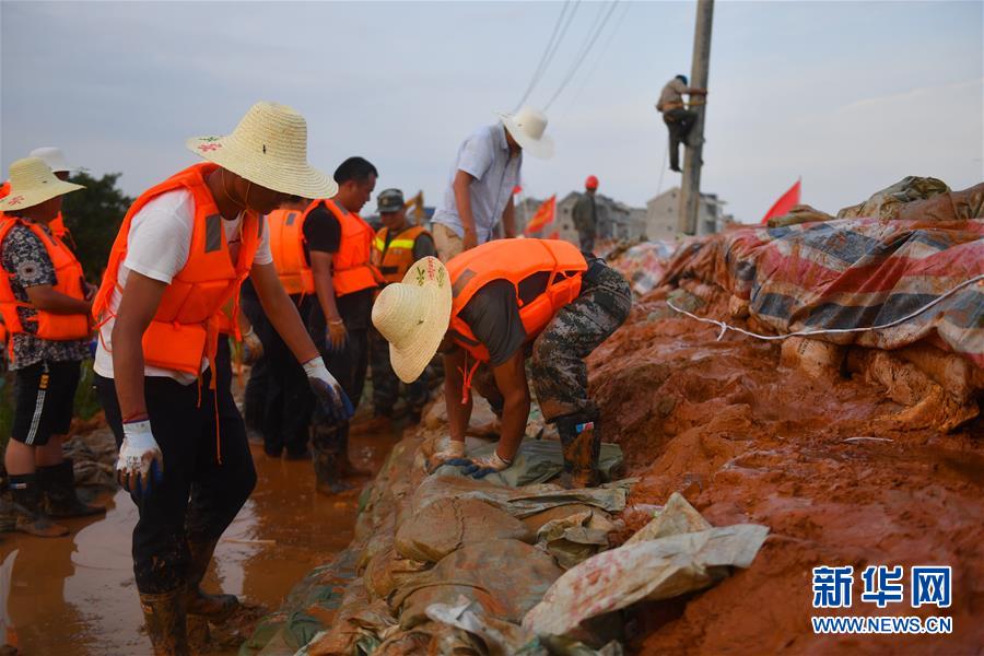 在江西鄱陽縣昌江圩,武警江西總隊機動支隊的工作人員和當地村民一起加固圩堤(7月12日攝)。新華社記者 胡晨歡 攝