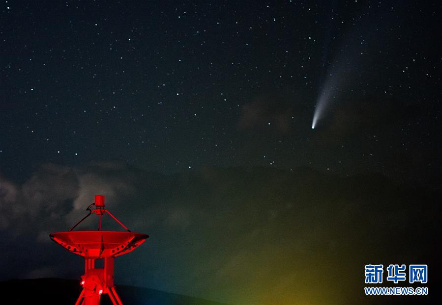 7月18日晚,在明安圖觀測基地,尼歐懷茲彗星劃過天際。7月18日晚至19日凌晨,在位于內蒙古錫林郭勒盟正鑲白旗境內的國家天文臺明安圖觀測基地,尼歐懷茲彗星劃過天際。在明安圖觀測基地內,排列著100面白色的拋物面天線。這個龐大的天線陣列便是草原“天眼”——明安圖射電頻譜日像儀。草原“天眼”持續接收太陽射電輻射,然后由科研人員進行數據分析研究,對空間環境監測、太陽活動預報均有重要作用。新華社記者連振攝