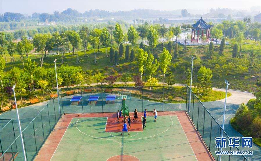 7月20日,市民在河北省武邑縣觀津公園內健身(無人機照片)。新華社記者李曉果攝