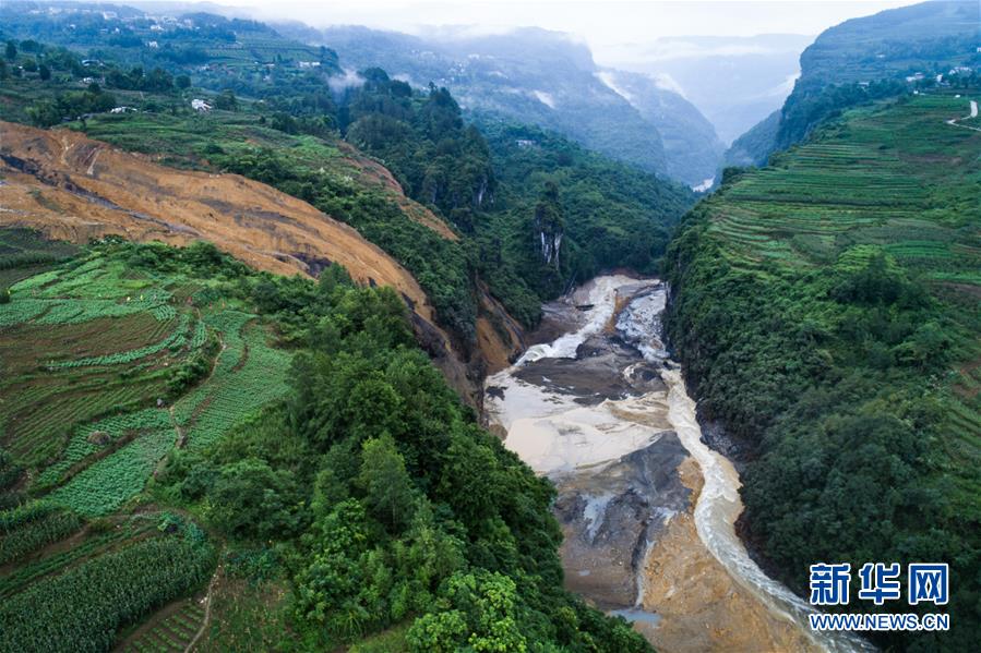 7月22日拍攝的因恩施州屯堡鄉(xiāng)馬者村山體滑坡形成的堰塞湖(無(wú)人機(jī)照片)。新華社記者肖藝九攝