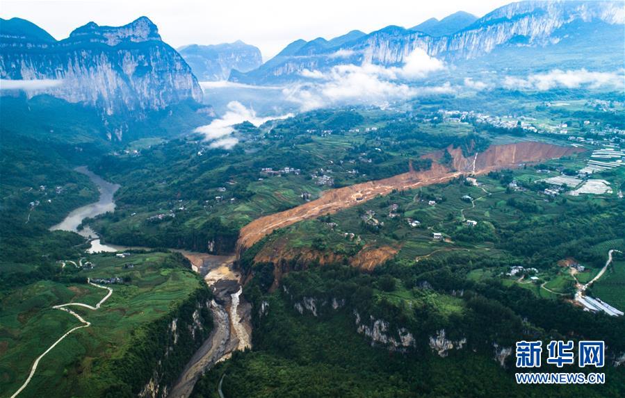 7月22日拍攝的因恩施州屯堡鄉馬者村山體滑坡形成的堰塞湖(無人機照片)。新華社記者肖藝九攝