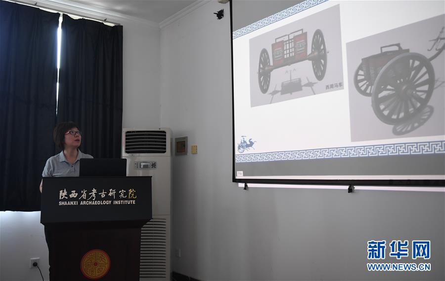 7月30日,在陜西省考古研究院涇渭基地,陜西省考古研究院副研究員黃曉娟介紹西周晚期青銅輪牙馬車復(fù)原情況。新華社記者李一博攝