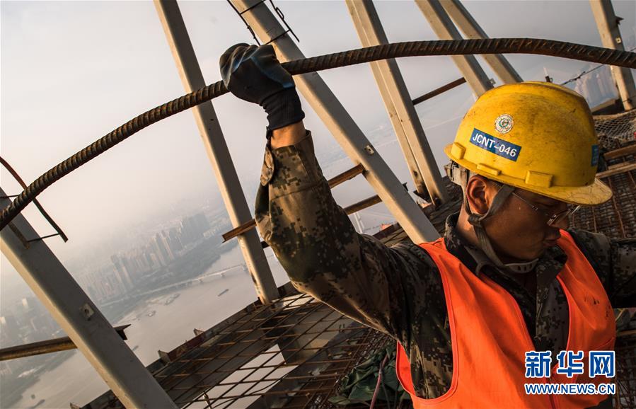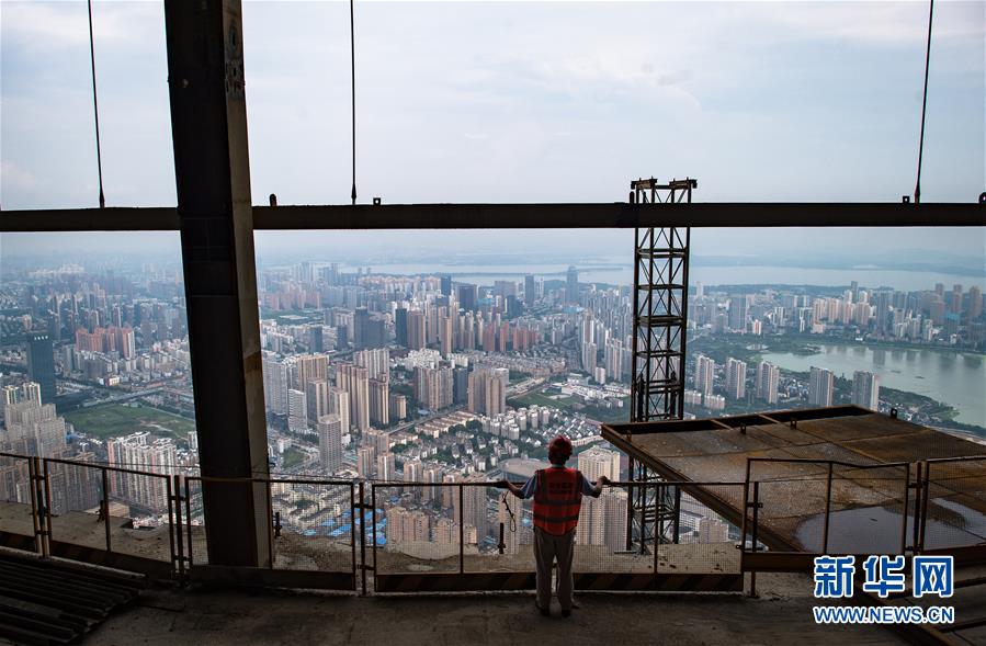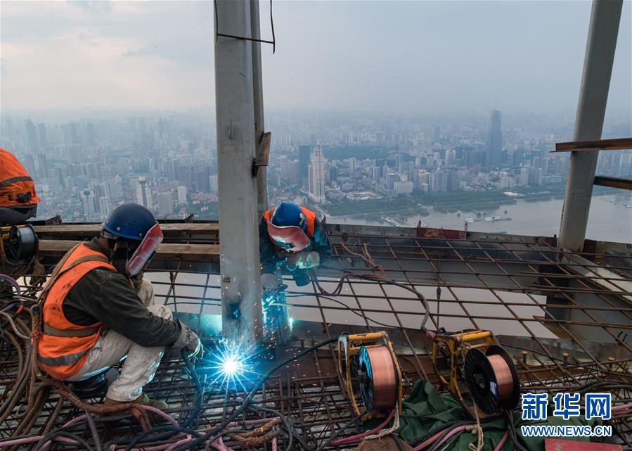 8月11日,工人在武漢綠地中心項目建設現場近500米的高空施工。新華社記者肖藝九攝