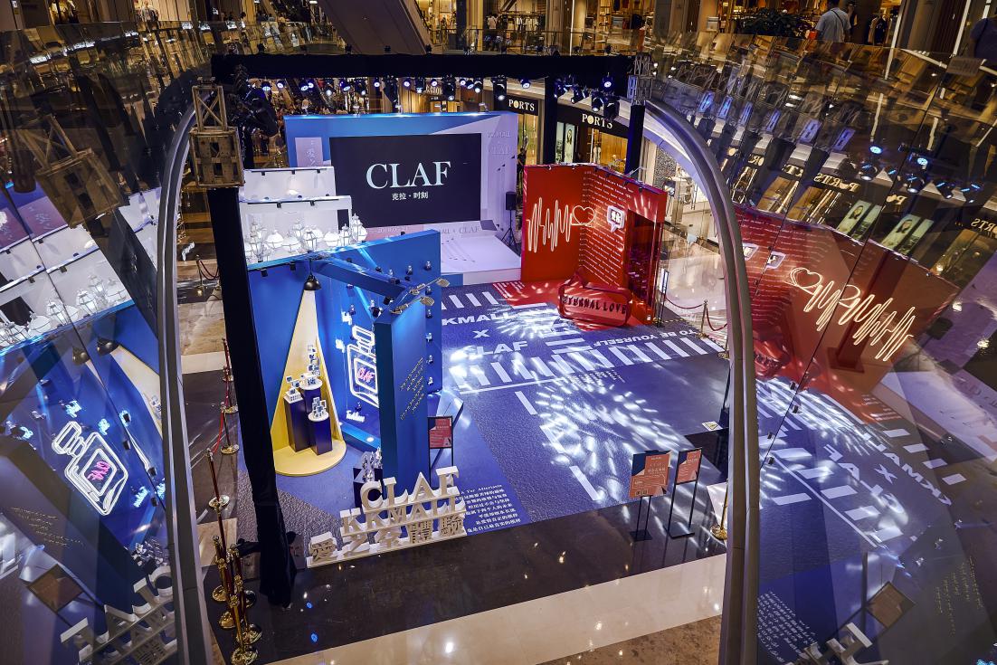 愛之全體驗靜態藝術展分為四個區域,分別對應 C-L-A-F(克拉時刻的英文),C對應白色區域,代表 C lassic(經典 ),在“C lassic”的區域中,洛杉磯郡藝術博物館標志地標-燈柱( Urban Light)與文藝復興的石膏像相結合,打造一片純凈又不失時尚的打卡區域。L對應紅色區域,代表Love(愛),設計了以“心電感應”的一堵墻面,描繪遇到“愛情”的場景,從“正常”的心電圖到遇見“愛”的怦怦心跳,純紅色的背景是打卡拍照的最佳地點。 A對應藍色區域,代表Aftertaste(回味),整體背景運用國際克萊因藍,形成撞色的沖擊感。利用香水瓶,打造了一個藍色的“氣味收藏室”。F對應黑色區域,代表Forever(永恒),運用霓虹燈管打造神秘時尚的氛圍,就像鉆石一樣在黑暗中閃爍,黑色背景成為許多人打卡點,仿佛電影橋段般的文字設計,非常適合還原電影場景。