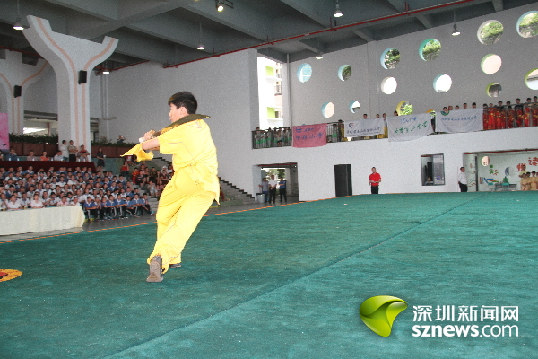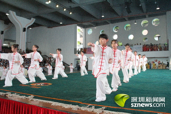 深圳新聞網訊(記者 王志明 通訊員趙小平)長拳如虹,刀光棍影。5月26日,南山區2017年中小學傳統文化節武術展示活動在南山外國語學校(集團)大沖學校精彩上演,來自南山區西麗二中、南頭城小學等16所學校幼兒園的師生“以武會友”,進行了太極劍、南拳和刀術等48個項目角逐,并向大家展示了所學到的“中國功夫”。南山區副區長練聰觀看了武術展示。