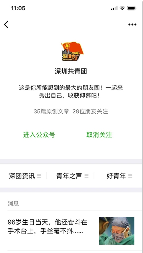 案例介紹:“深圳共青團(tuán)”微信公眾號于2013年開通,是全省最早開通的政務(wù)微信號。在近兩年加大力度建設(shè)和推廣后,粉絲數(shù)有了飛躍性的增長,推送閱讀量和影響力也有了比較明顯的提升。截至目前,累計(jì)推送1700余篇,平均閱讀量1萬以上,單篇最高閱讀量達(dá)到36萬,粉絲數(shù)90余萬。目前,公眾號影響力在全國地市級團(tuán)委中排名前3,在全市政務(wù)新媒體中排名前5。在發(fā)布的內(nèi)容上,主要關(guān)注時(shí)政要聞、社會熱點(diǎn)、政策解讀等與青年息息相關(guān)、喜聞樂見的話題內(nèi)容,弘揚(yáng)愛國精神和時(shí)代精神,是深圳共青團(tuán)聯(lián)系、引導(dǎo)和服務(wù)青年的重要載體。