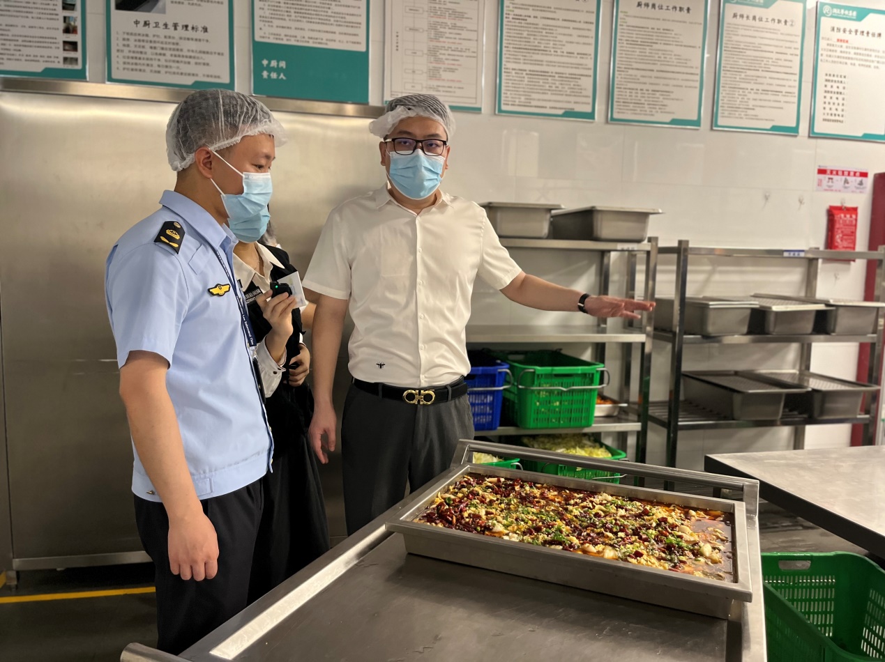 執法人員現場對學校后廚進行詳細檢查,分別從采購索證索票、進貨查驗、制作加工、備餐配送、場所和設施清潔維護、餐飲具清洗消毒、從業人員健康管理,制止餐飲浪費,食品安全總監配置履職情況,以及落實主體責任的“日管控周排查月調度”制度等方面進行詳細檢查。經檢查,整體情況良好,但存在部分細節問題,如水產品刀具分類可更細致、操作臺積水需清理、面點間的食材存放需避免陽光直射等,針對檢查過程中發現的問題,執法人員現場責令學校限期整改到位。同時,快檢工作人員對餐廳使用的食材進行了抽檢,結果均為陰性。